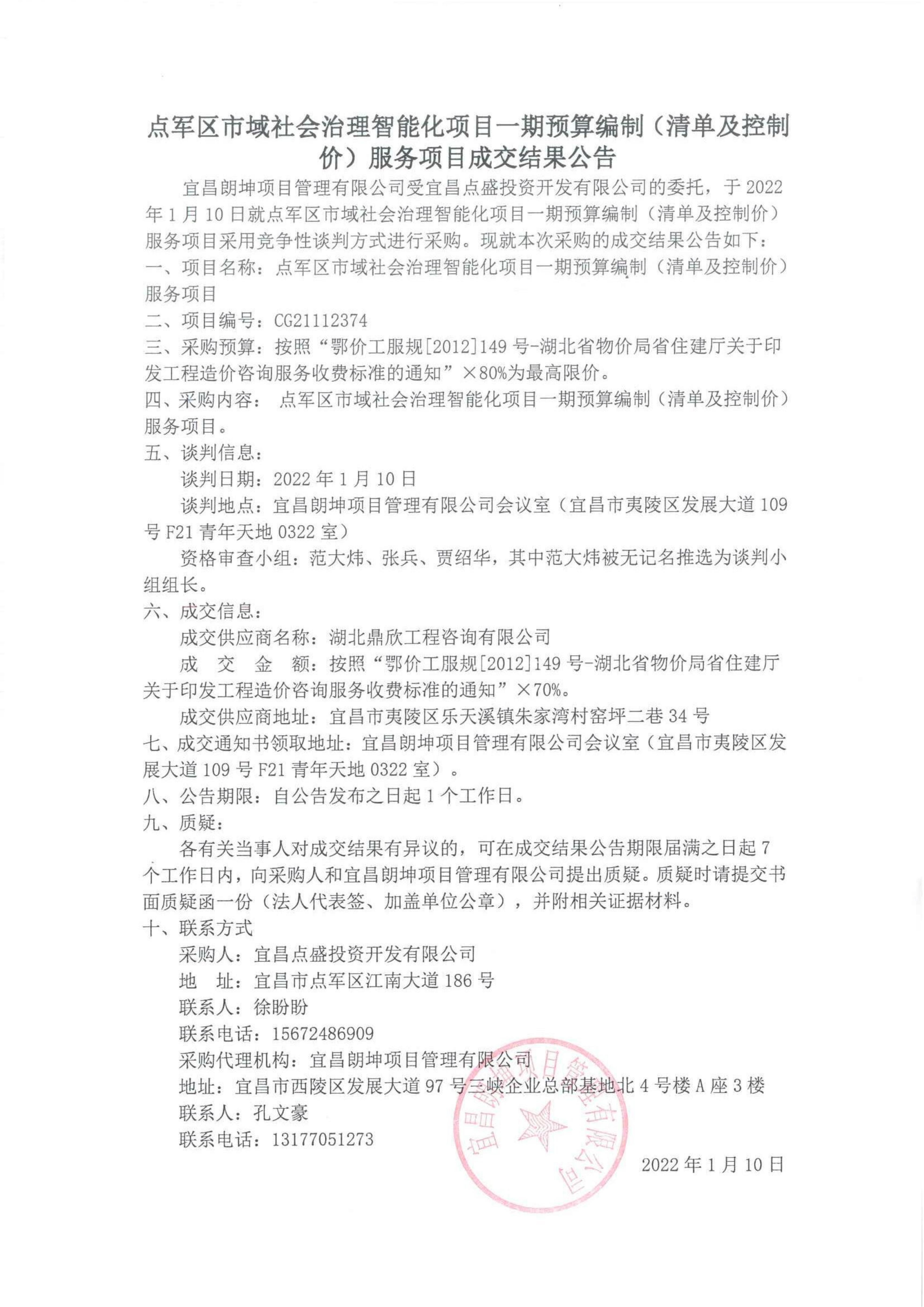 點軍區(qū)市域社會治理智能化項目一期預(yù)算編制(清單及控制價)服務(wù)項目成交結(jié)果公告