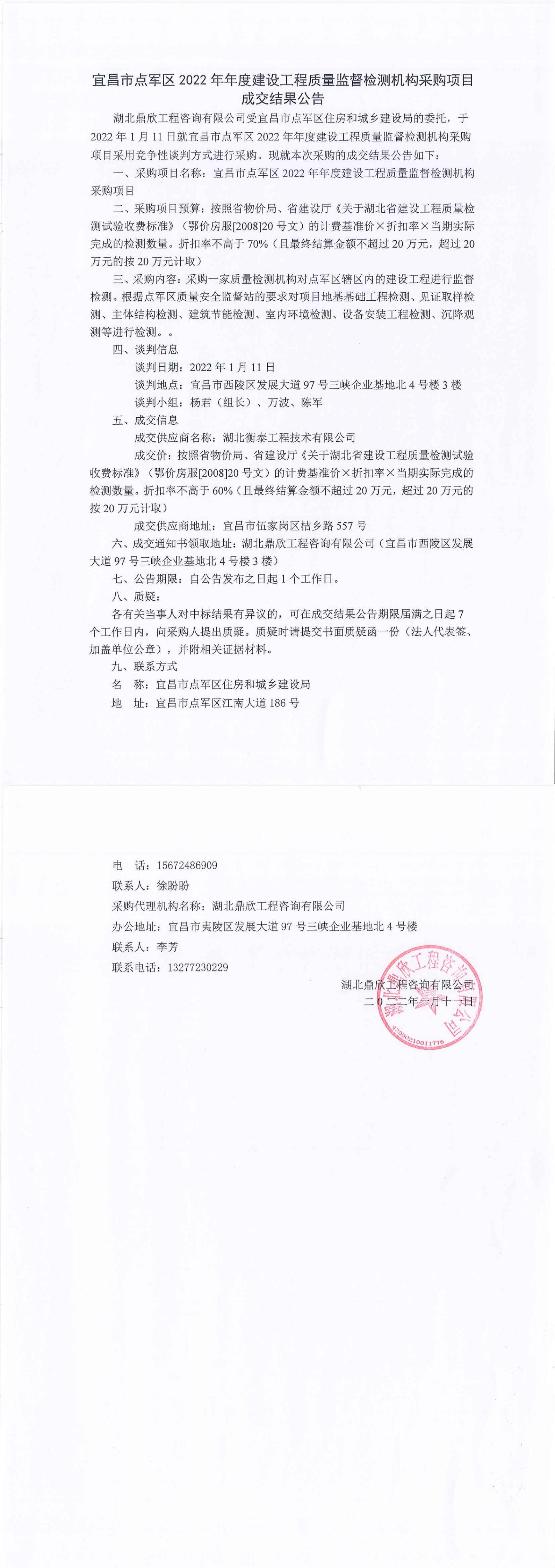 宜昌市點(diǎn)軍區(qū)2022年年度建設(shè)工程質(zhì)量監(jiān)督檢測機(jī)構(gòu)采購項(xiàng)目成交公告