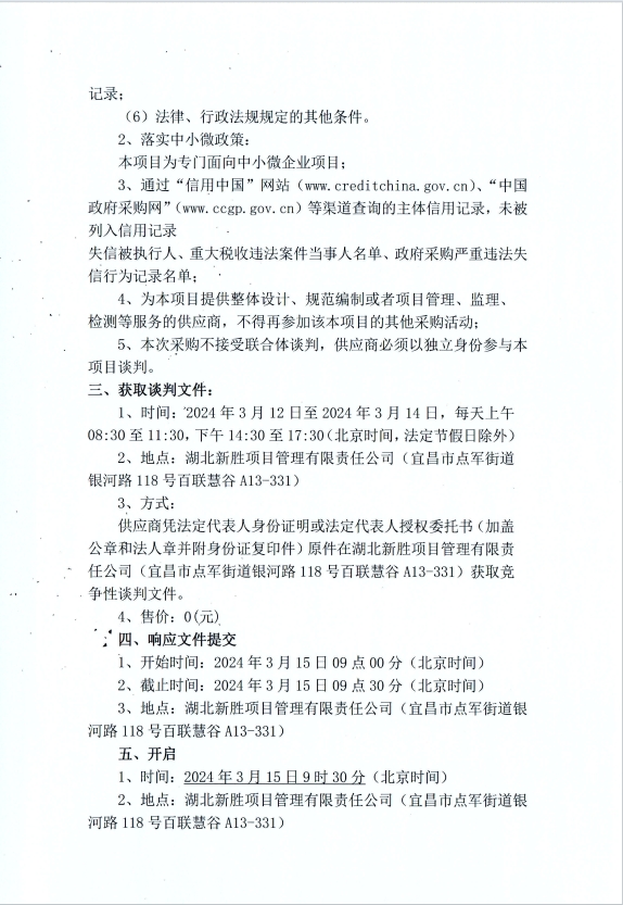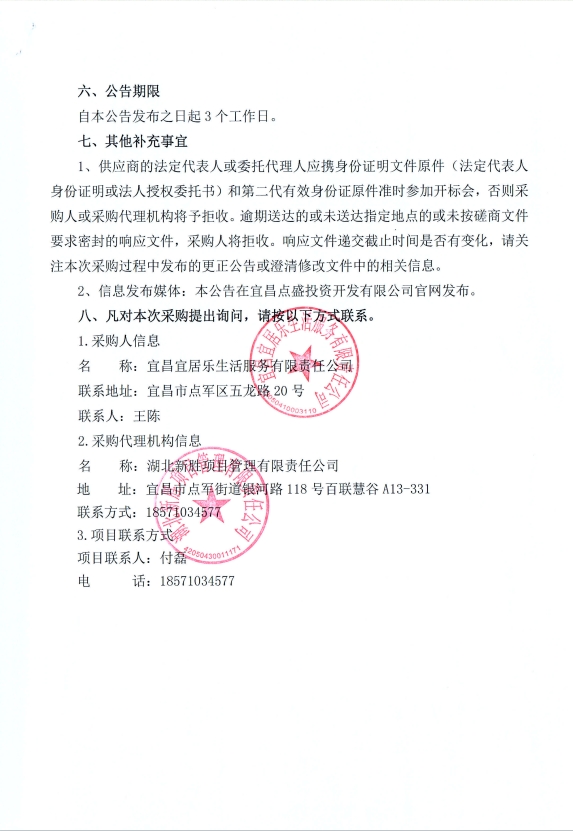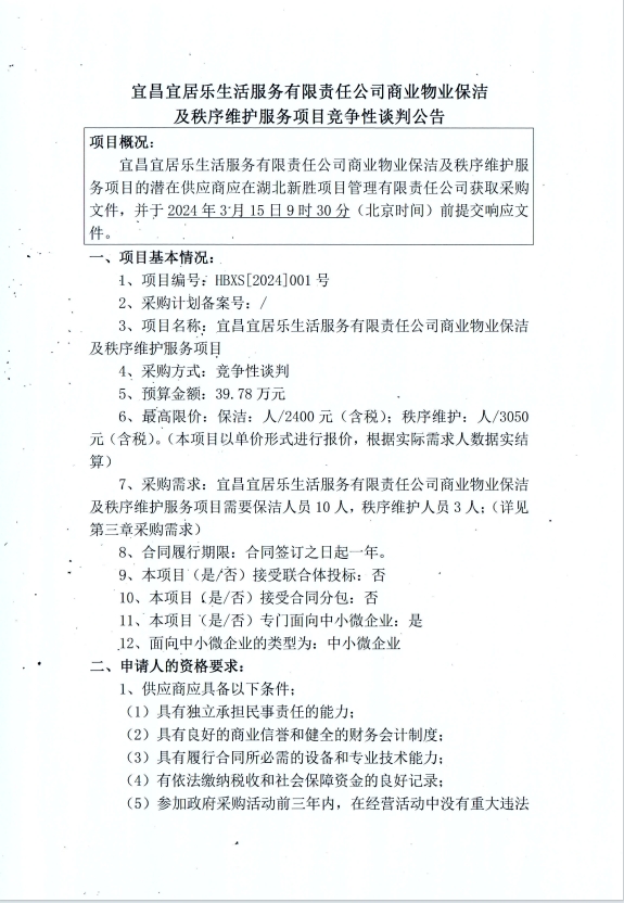 宜昌宜居樂生活服務(wù)有限責(zé)任公司商業(yè)物業(yè)保潔及秩序維護(hù)服務(wù)項(xiàng)目競爭性談判公告