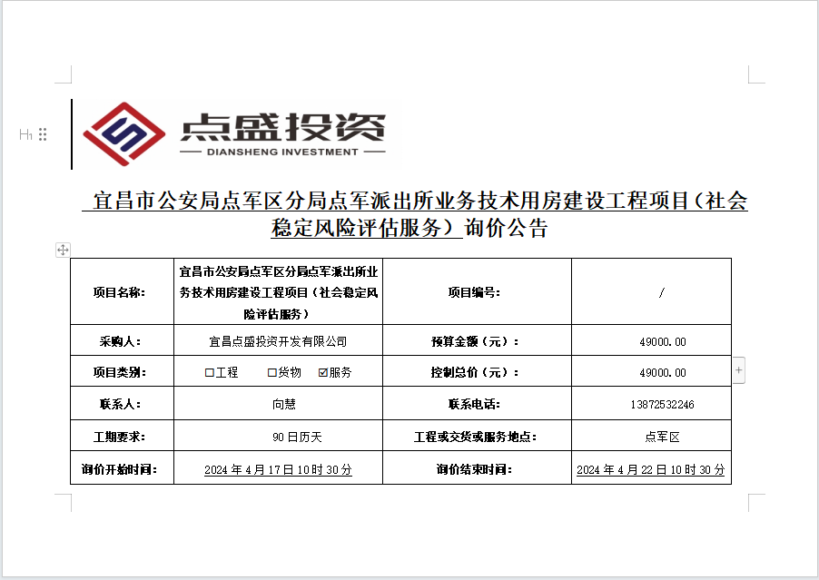 宜昌市公安局點(diǎn)軍區(qū)分局點(diǎn)軍派出所業(yè)務(wù)技術(shù)用房建設(shè)工程項(xiàng)目(社會穩(wěn)定風(fēng)險(xiǎn)評估服務(wù))詢價公告