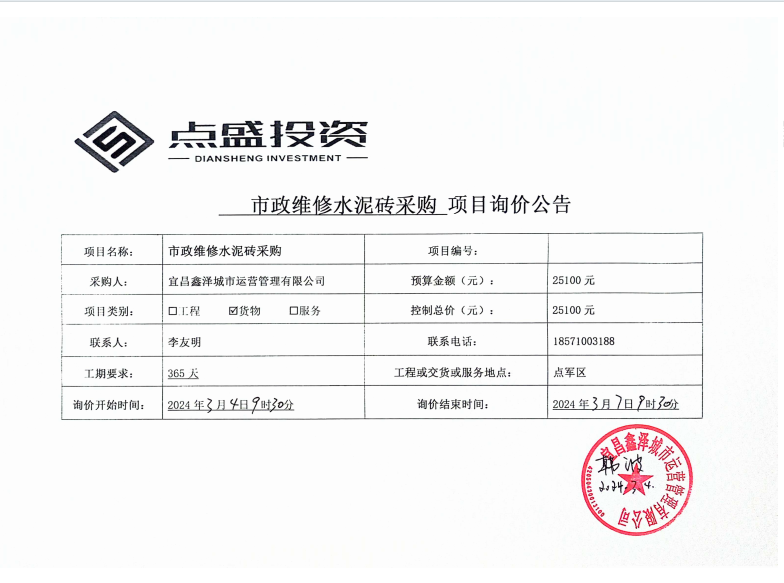 宜昌鑫澤城市運(yùn)營(yíng)管理有限公司市政維修水泥磚采購(gòu)項(xiàng)目詢價(jià)公告