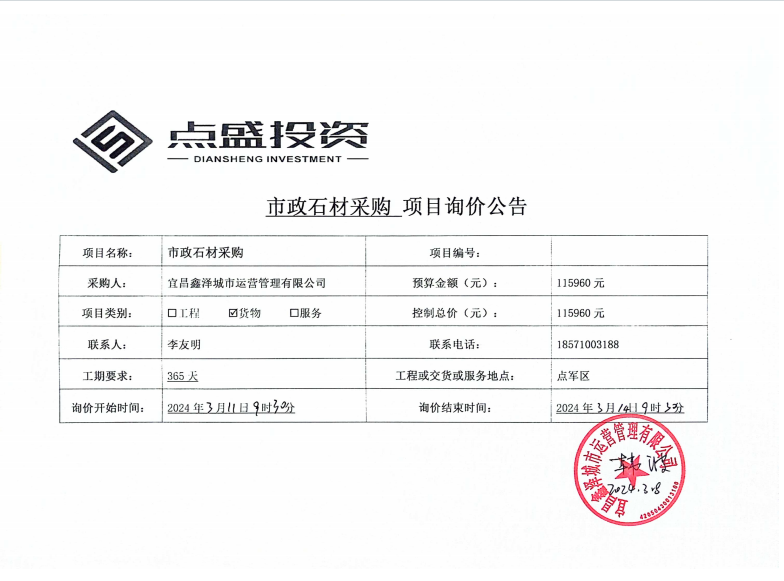 宜昌鑫澤城市運(yùn)營(yíng)管理有限公司市政維修石材采購(gòu)項(xiàng)目詢價(jià)公告