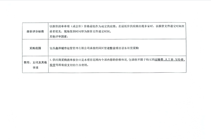 宜昌鑫澤城市運(yùn)營(yíng)管理有限公司管道敷設(shè)設(shè)備租賃采購項(xiàng)目詢價(jià)公告