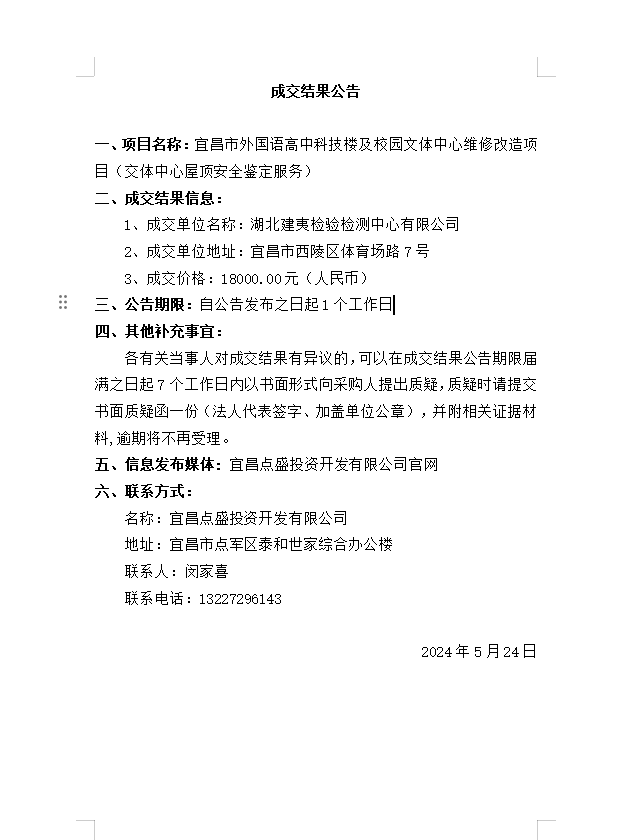 宜昌市外國語高中科技樓及校園文體中心維修改造項目(交體中心屋頂安全鑒定服務(wù))成交公告