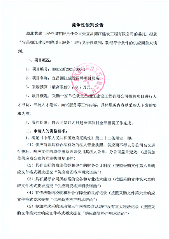 宜昌擁江建設(shè)招聘項目服務(wù)競爭性談判公告