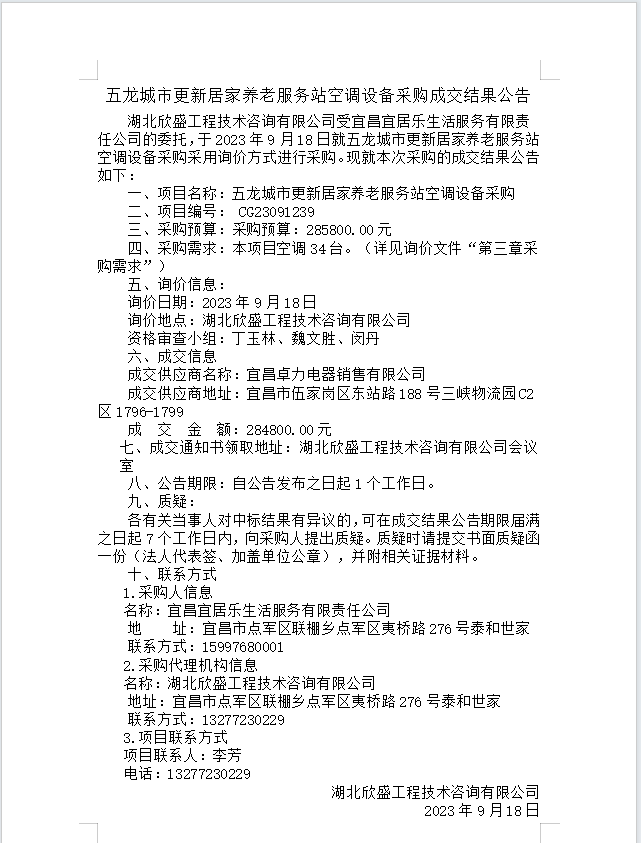 五龍城市更新居家養(yǎng)老服務站空調設備采購成交結果公告