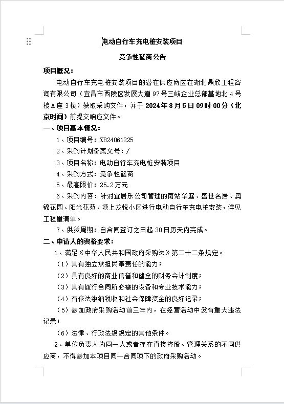 電動(dòng)自行車充電樁安裝項(xiàng)目競(jìng)爭(zhēng)性磋商公告
