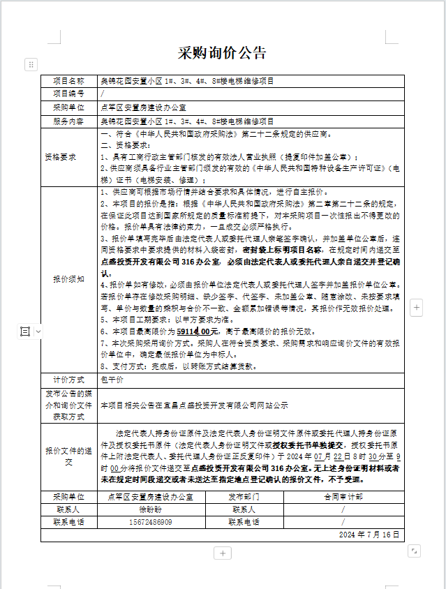 奧錦花園安置小區(qū)1#、3#、4#、8#樓電梯維修項(xiàng)目詢價(jià)公告