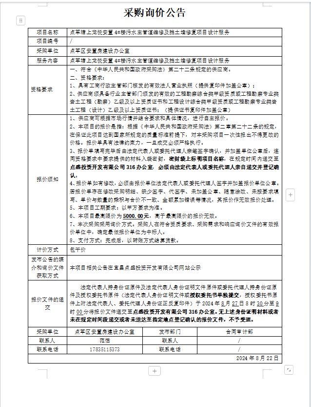 點軍塘上龍悅安置4#樓污水主管道維修及擋土墻修復項目設計服務詢價公告