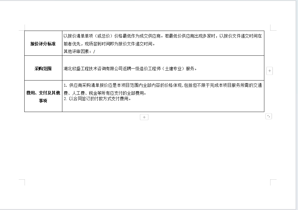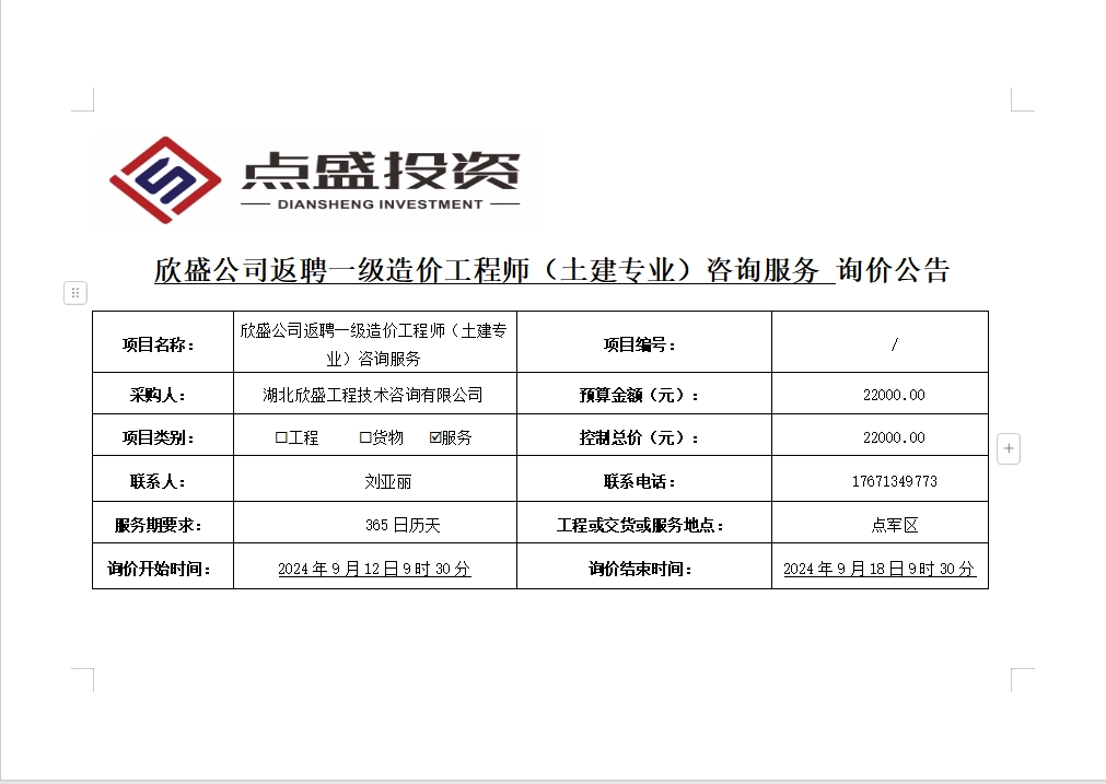 欣盛公司返聘一級造價(jià)工程師(土建專業(yè))咨詢服務(wù)詢價(jià)公告