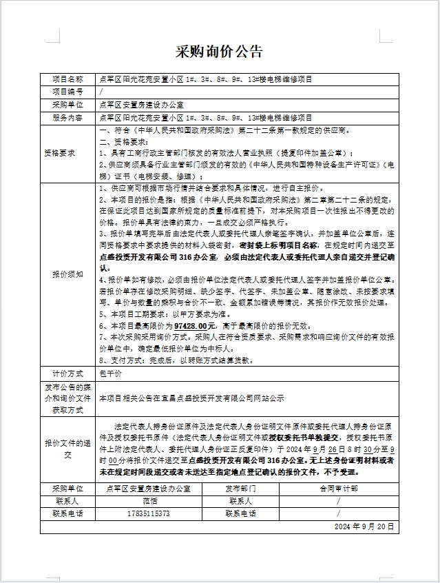 點(diǎn)軍區(qū)陽(yáng)光花苑安置小區(qū)1#、3#、8#、9#、13#樓電梯維修項(xiàng)目詢價(jià)公告