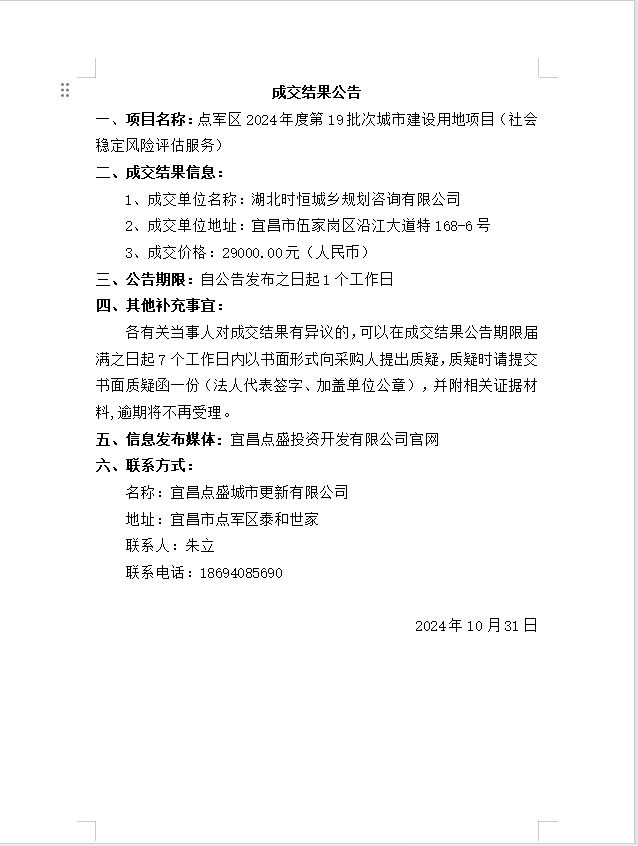 點軍區(qū)2024年度第19批次城市建設用地項目(社會穩(wěn)定風險評估服務)成交公告